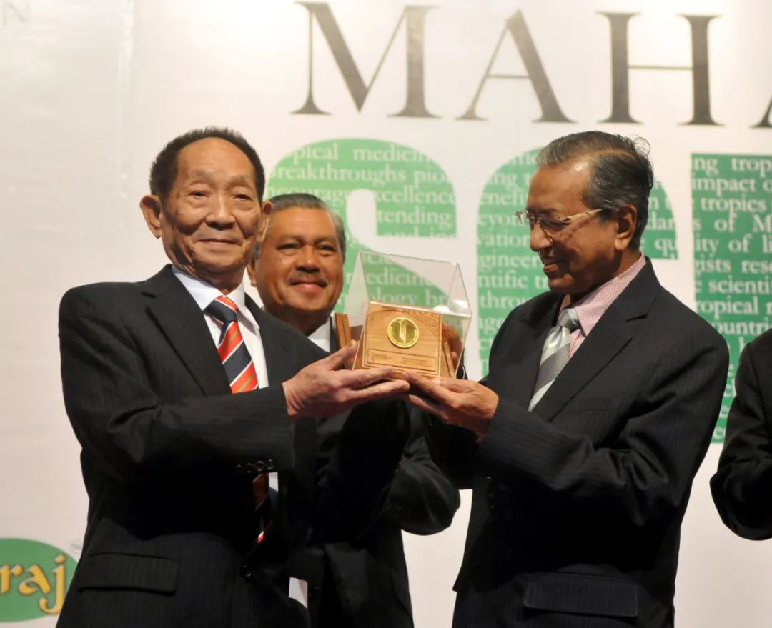 2012年1月31日,在马来西亚吉隆坡,马来西亚前总理马哈蒂尔(右)为袁隆平(左)颁发2011年“马哈蒂尔科学奖”,表彰他在热带农业发展领域的贡献。新华社发