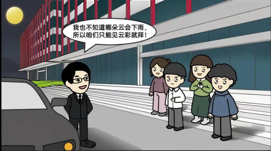 在李政道研究所有一幅漫画,其中画着一个小人,正在跟着几个小人在说:“我也不知道哪片云彩会下雨,我们现在是见云彩就拜”。这其实是李所大楼门口经常出现的一个真实场景,就是经常在我与李所的同事们送各级政府部门领导、企业家或者捐赠人走了之后,我一回头,看到参与活动的李所同事们眼睛都睁得大大地在看我,于是我就只能这样跟他们说。