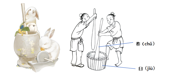 玉兔“捣药”动作的原型,其实就是古人用杵臼加工粮食的劳动场景。古代的粮食收获后,很多并不能直接食用。需要用杵臼舂米去壳,才能变成我们吃的大米和小米,煮成团圆的米饭。