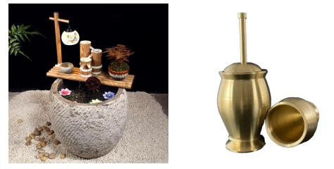 此外,石臼还成了工艺品、收藏品。如:庭院装饰、养鱼盆、花盆等。铜制或铁制的药臼仍是捣碎药材的常用工具,这是杵臼最直系的现代传承。