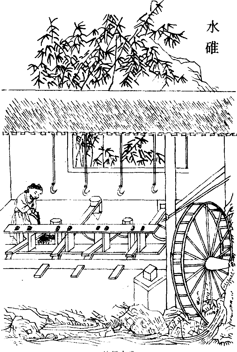 西汉时期,出现了水碓,通过水流冲击水轮,带动连杆和凸轮,使一排碓头交替起落,可以日夜不息地工作,连续不断地舂米。不仅如此,水碓还可用于捣碎矿石、造纸打浆等。水碓的效率是人力杵臼的百倍,这是古代农业机械化的伟大成就。