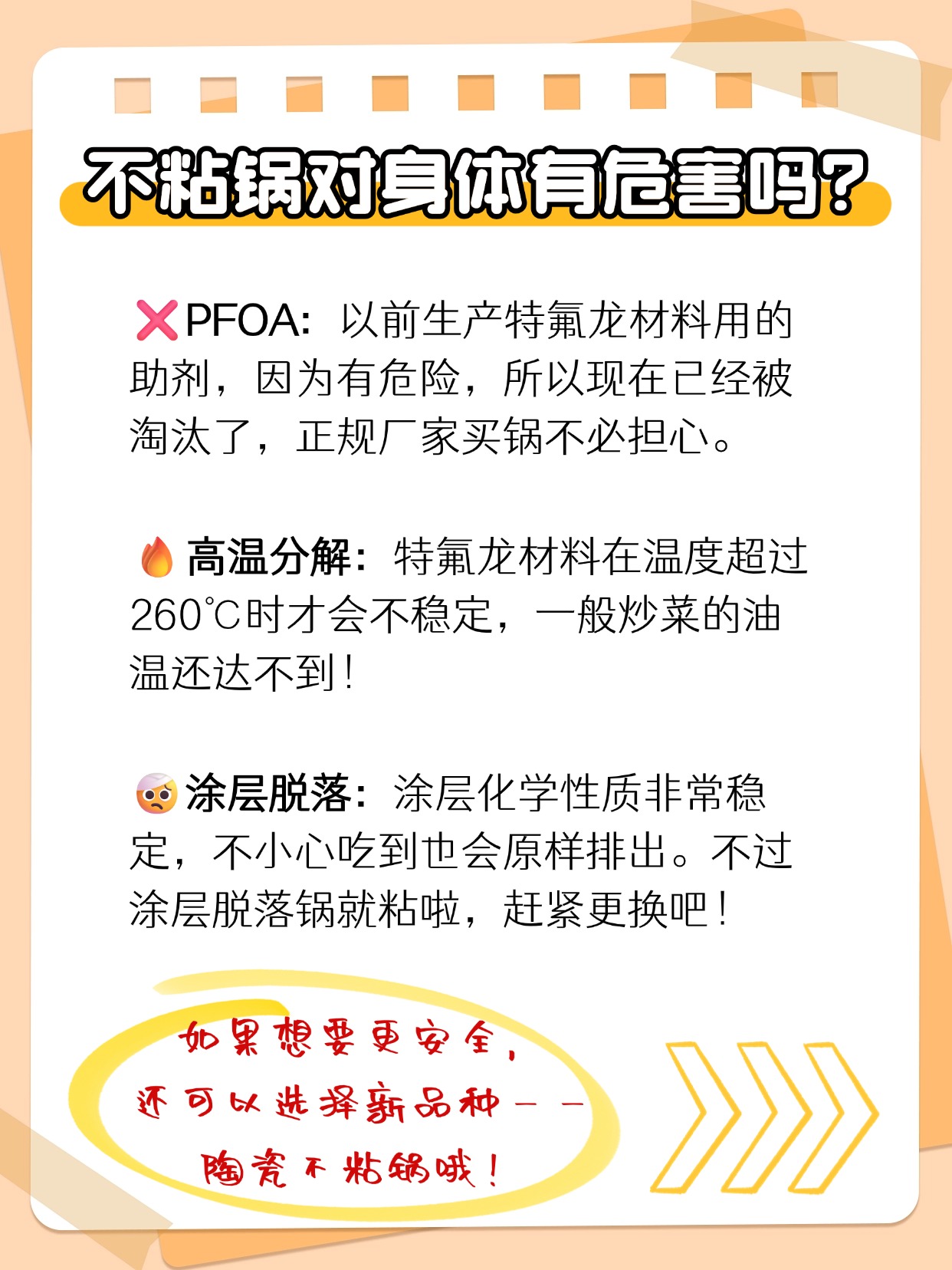 •涂层脱落:特氟龙材料非常稳定,就算吃下去一点点也能原样排出来,没有大问题!不过,涂层掉了就变成“粘锅”啦,这样做菜容易烧糊产生有害物质,赶紧换锅啦~