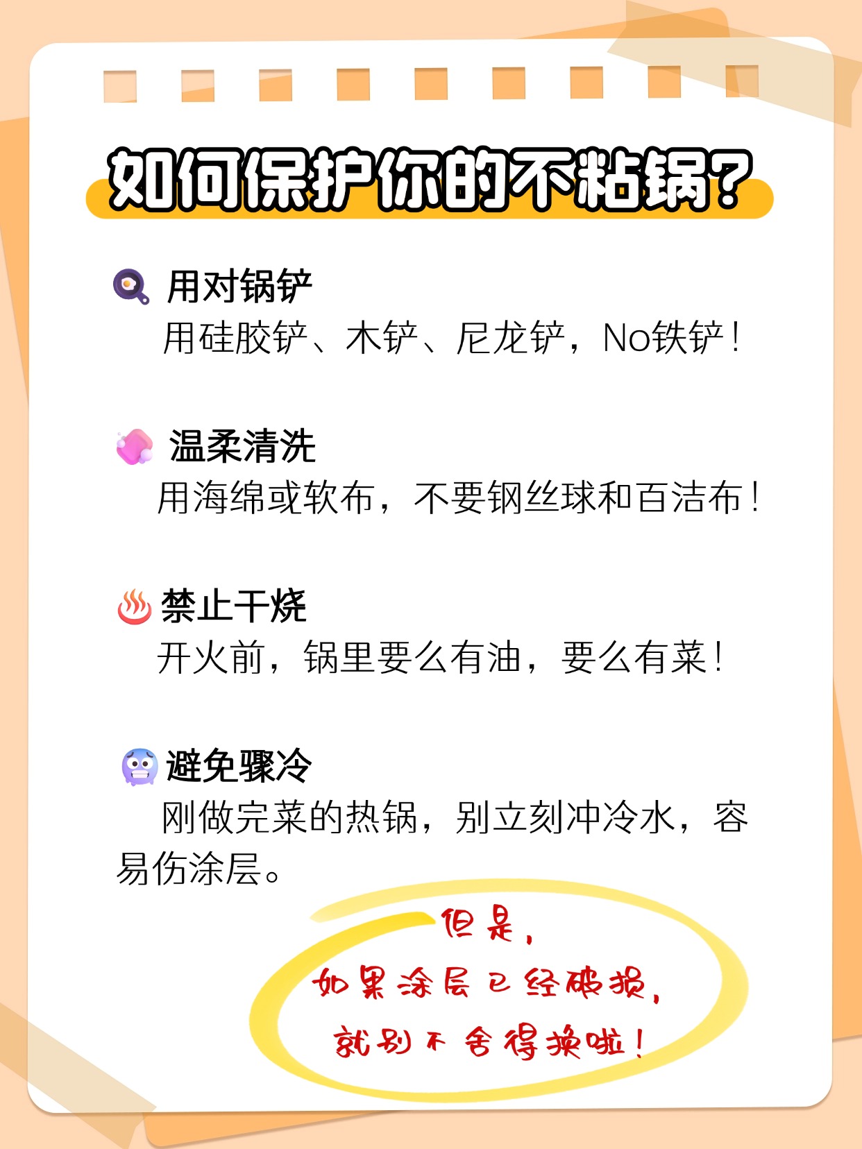 不粘锅虽然好用,但也娇气,使用不注意就容易变成“粘锅”。注意以下几点,让你的不粘锅多陪你几年✅: