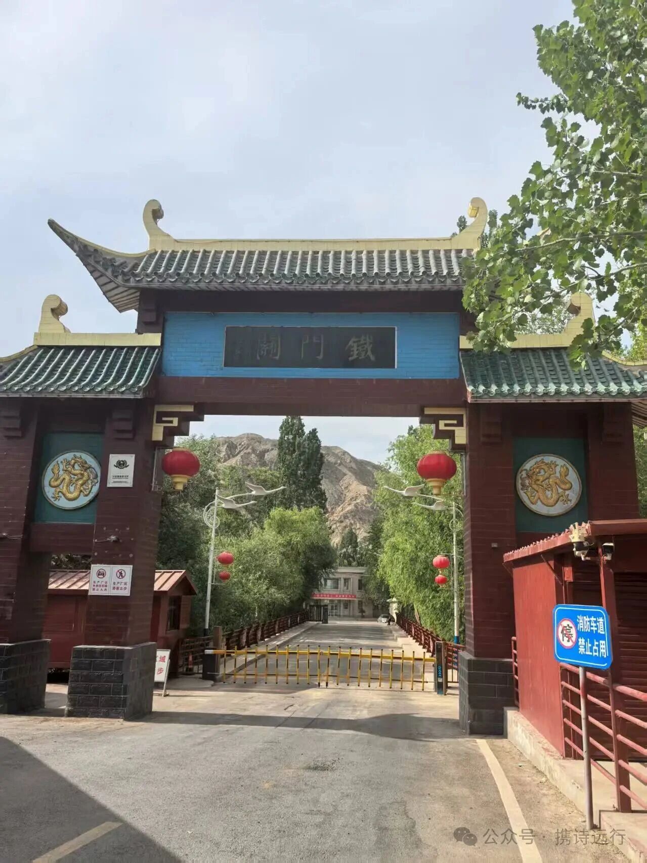 从库尔勒市区向北驱车八公里,行到路的尽头,一座高大的赭红色门楼挡在眼前,门楼上三个苍劲的大字仿佛告诉你:“‘铁门关’到了”。