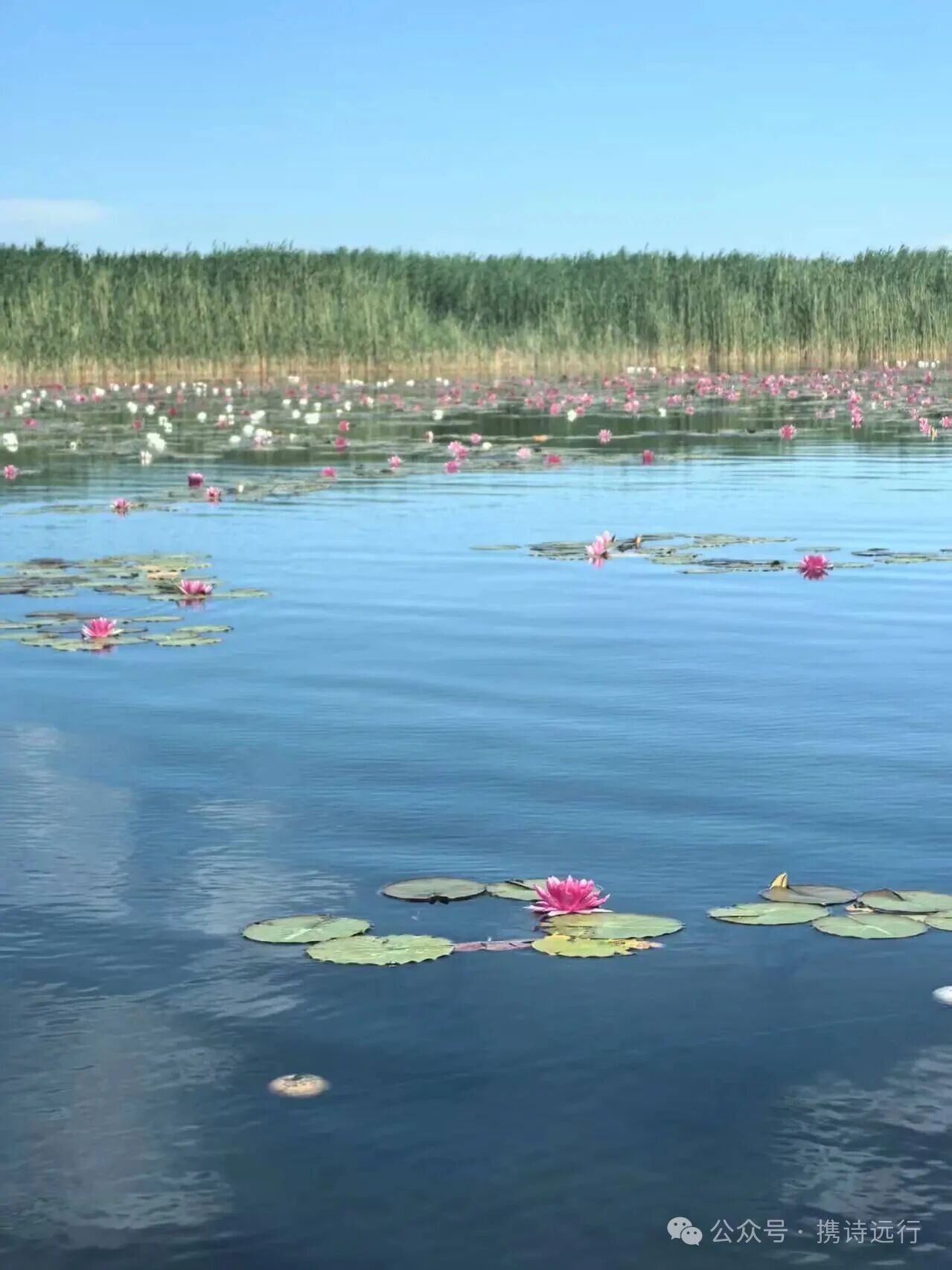戈壁骤现葱茏,喜风拂苇梢,靛波微皱。雪融天脉,斯年融汇,博斯腾就。莲开三色艳,映得镜面玲珑剔透。打卡地,孔雀雕塑,本是河水源首。
