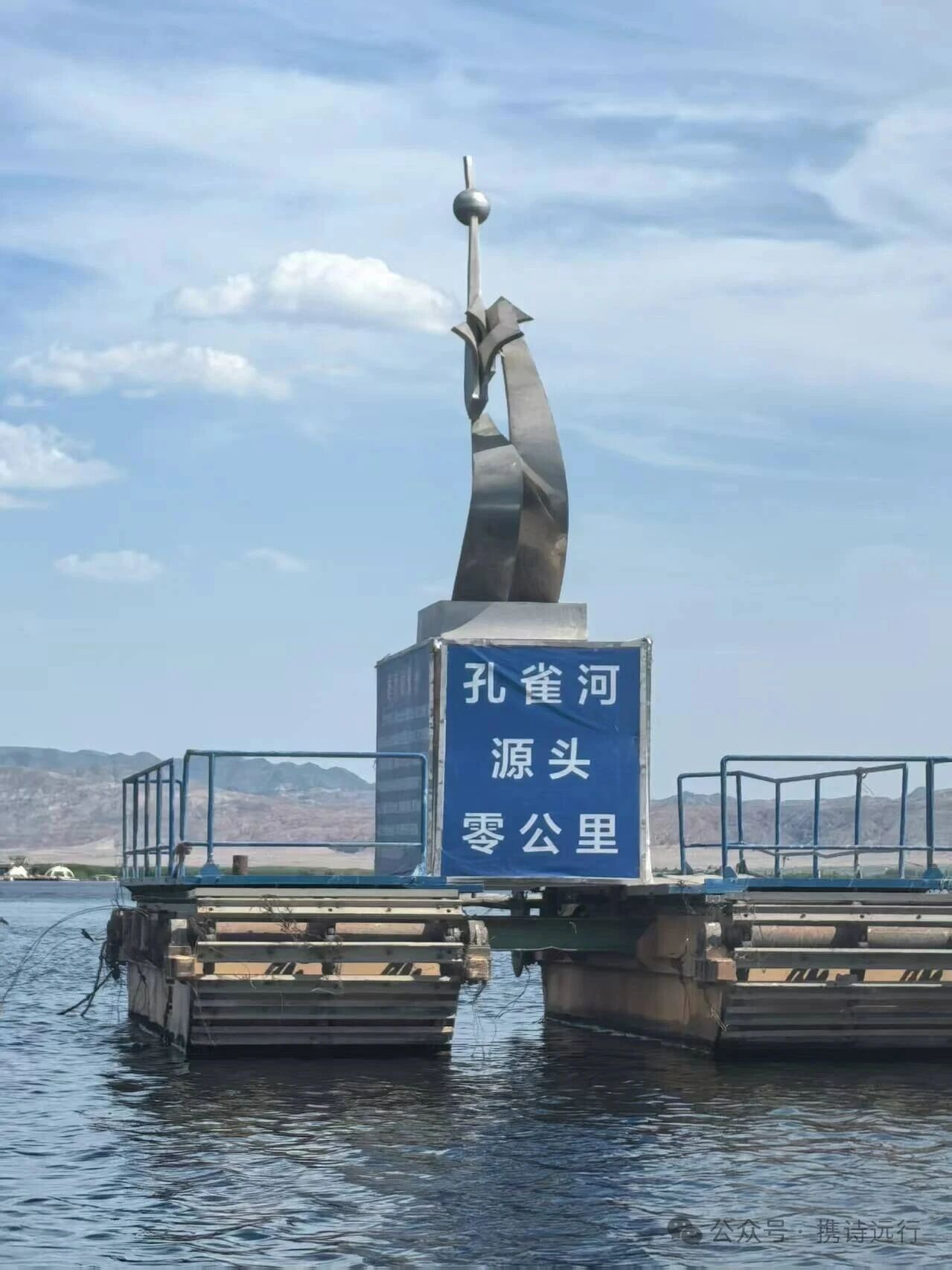 离睡莲花海不远的地方有一条浮船,船上耸立着一座银白色雕塑,近看是一只展翅欲飞的孔雀,雕塑基座上书有“孔雀河源头零公里”8个大字。美丽的孔雀河就是从这片湖沼开始它的旅程,通过铁门关峡谷流入库尔勒,继而滋养整个巴州民众。