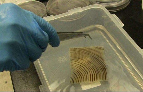 完成这一步后,木头会变成一个乳白色的、由中空细胞构成的“骨架”。在这之后,研究人员需要向其中填充“透明胶”。