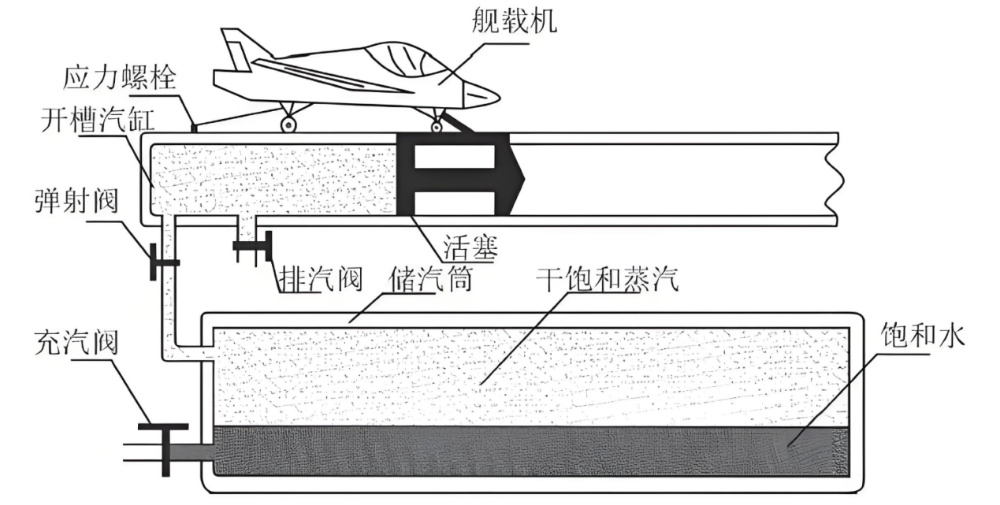 蒸汽弹射的原理与弩箭发射大同小异,也是一个能量转换的过程,只不过预先存储的能量不是弹性势能,而是饱和蒸汽的内能,弹射的目标是更重的飞机,因此装置也复杂很多。