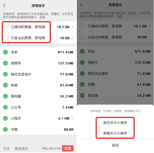 路径:存储空间→缓存→去清理→分别点击“已接收的原图/原视频”及“已发出的原图/原视频”→选择“按文件大小排序”→批量删除群聊大文件(如50MB+视频)→清理后文件转为普通画质缩略图。