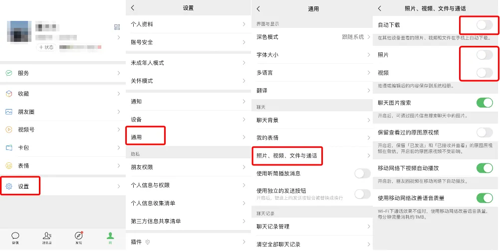 路径:设置→通用→照片、视频、文件和通话→关闭“自动下载”→同步关闭“照片”和“视频”保存到相册的开关。