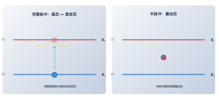 这种对能级跃迁的精确控制,是量子计算中实现基本逻辑操作的关键。更进一步,如果只施加一个“半脉冲”的微波信号——即没有完全驱动量子比特从 E₀ 跳到 E₁,那么量子比特就会处于 E₀ 与 E₁ 的叠加态。