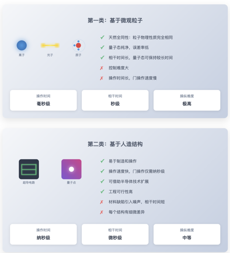 第一类量子计算机基于微观粒子,如离子、光子或原子,通过操纵和测量它们的量子态来计算。同类型的微观粒子在物理性质上完全一致,这对多粒子量子干涉和纠缠的实现中具有重要作用。同时,这些粒子在良好隔离条件下能保持较高的量子态纯度、较低误差以及较长的相干时间(即量子态的保持时间)。然而,对这些粒子的精准操作在当前技术水平下难度仍然很大,且操作所需的时间通常较长。