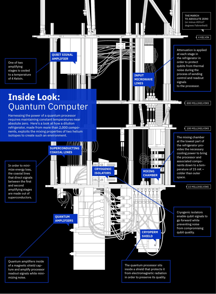 图中展示的是 IBM Q 量子计算机的制冷系统结构。整个结构会被放置到稀释制冷机中,可以看到,其中包含用于控制和读取量子比特的微波导线;输入信号经过多级衰减器以降低噪声,输出信号则通过低噪声放大器放大;同时配备多层屏蔽装置以隔绝外部辐射,并使用经过精心选择材质的同轴电缆以保证在低温下的可靠传输并最小化热负载。从系统顶部到底部,温度逐级降低:最上层为室温区,最底层则可达到约 10 毫开尔文的极低温环境,为量子比特的稳定运行提供条件。