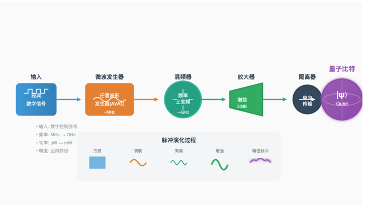 将经典计算机发出量子操作的指令转化为高精度微波脉冲,用于驱动、操控与读出量子比特,通常包含微波发生器、混频器、放大器和隔离器等器件。