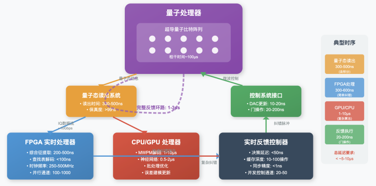 如下图所示,量子纠错系统是一个经典-量子混合系统,整个纠错环路必须实时完成纠错,纠错时间要远小于退相干时间。FPGA 的低延迟处理和 CPU/GPU 的强大算力相结合,配合精确的时序同步,确保在量子信息丢失前完成错误修正。