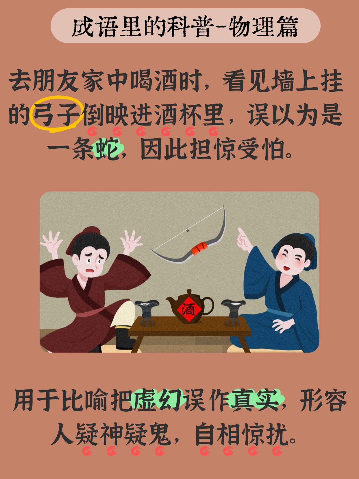 “杯弓蛇影”的故事,讲了晋朝的乐广邀请朋友到家中喝酒,墙上挂的弓子倒映进酒杯里,被朋友误以为是一条蛇。那位朋友因此担惊受怕,回到家就生病了。现在这个成语用于比喻把虚幻误作真实,形容人疑神疑鬼,自相惊扰。