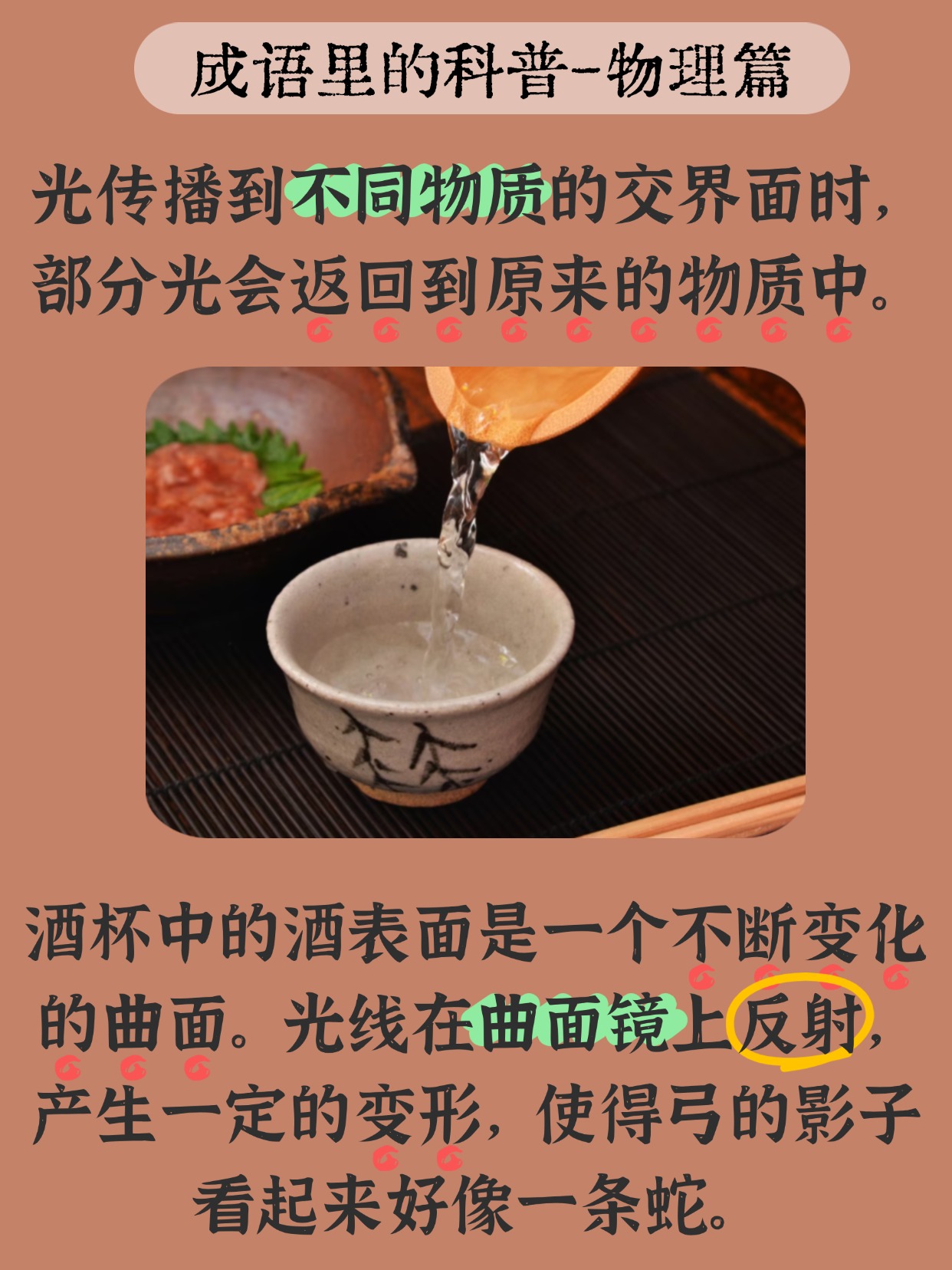 这个故事涉及的物理原理,就是光的反射:当光线传播到不同物质的交界面时,一部分光会返回到原来的物质中。在“杯弓蛇影”的故事中,酒杯中的液体表面就像一面镜子,将悬挂在墙上的弓的影像反射到了饮酒者的眼中。