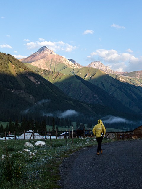 新疆伊犁,一个人走向前面的森林的自然风光