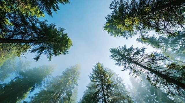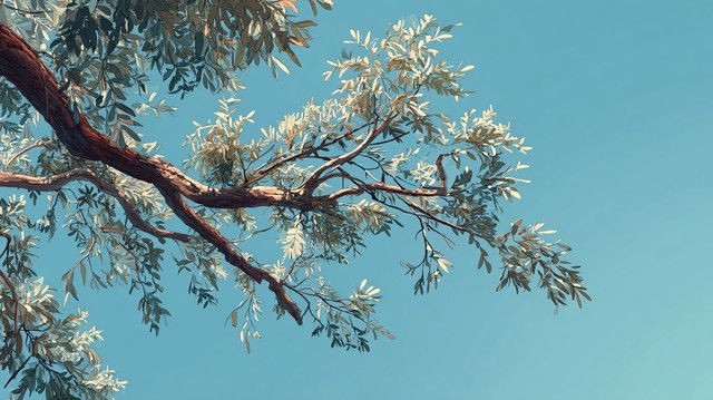 蓝天映衬下的树枝与绿叶,树叶,自然