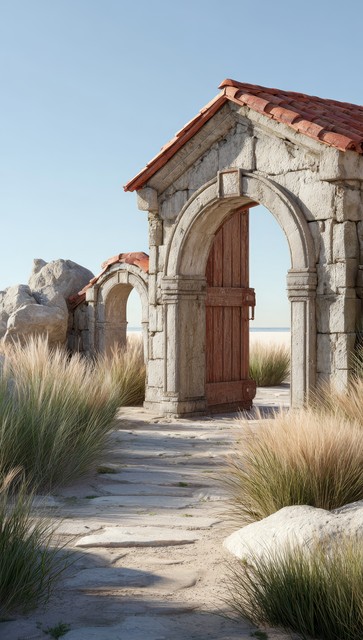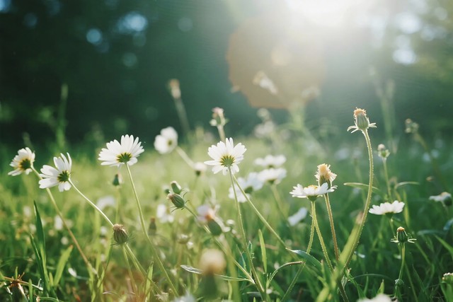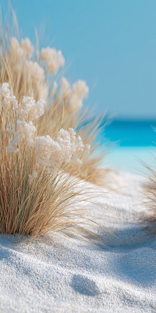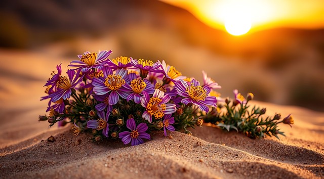 沙漠中,紫色花朵与黄色花蕊点缀着野花,日落时分,大自然的沙地景观展现其自然之美。