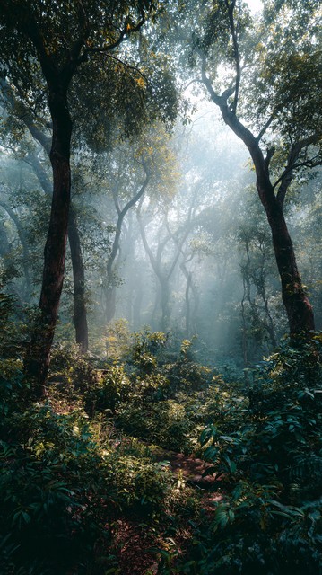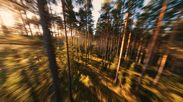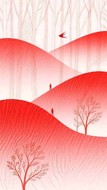 红色山丘上,树木葱茏,人物穿梭其间,飞鸟掠过天际,线条勾勒自然之美,渐变色彩渲染出宁静的大自然。
