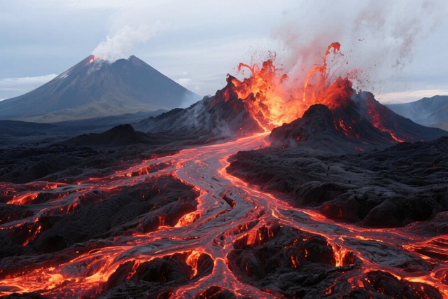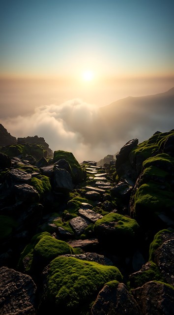 在户外的壮丽山景中,大自然的杰作——岩石、苔藓和云朵构成了一幅令人惊叹的自然风景画。