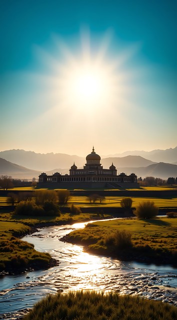 在自然的怀抱中,阳光照耀着宫殿,日出时分,大自然的穹顶建筑显得格外壮观。