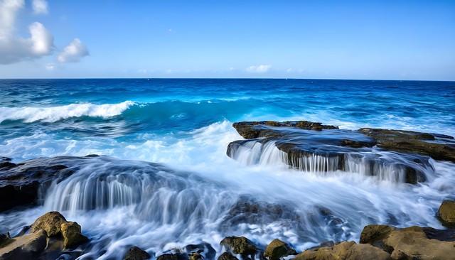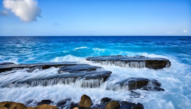 碧海蓝天,巨浪拍岸,岩岸礁石尽显自然力量。