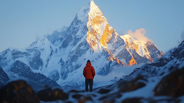 一人穿红外套,立于雪山前,山峰壮丽,阳光洒在雪上,展现自然之美与人类的渺小