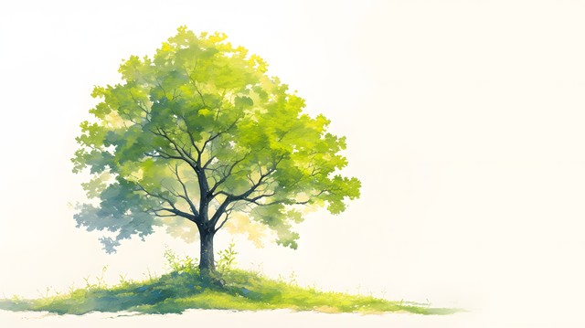 一棵绿树水彩插画,立于绿色草地之上,背景简洁