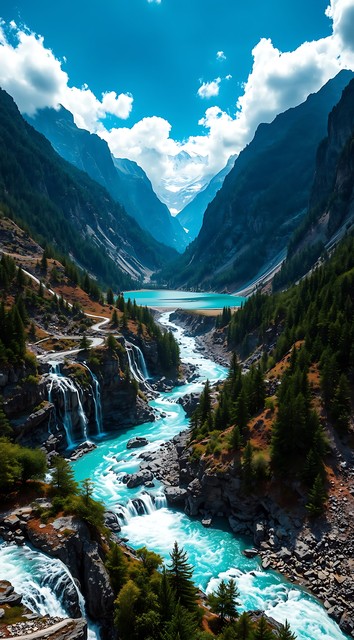 在大自然的怀抱中,山水峡谷间流淌着清澈的河流和飞泻的瀑布,森林深处是宁静的蓝天与飘逸的白云,湖泊映衬着自然的美景。
