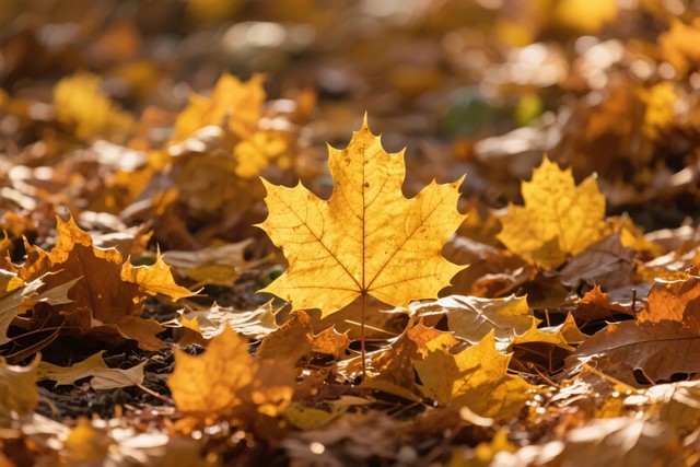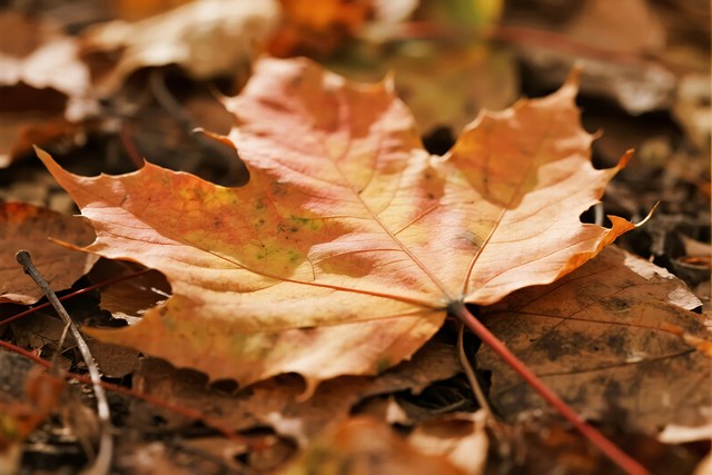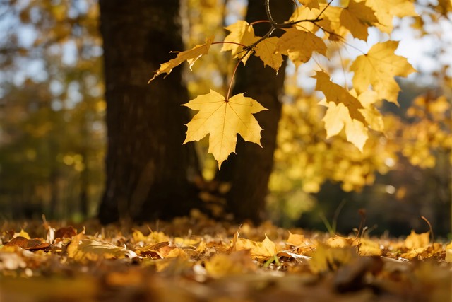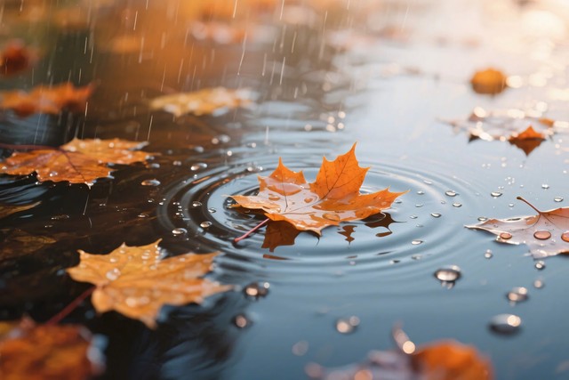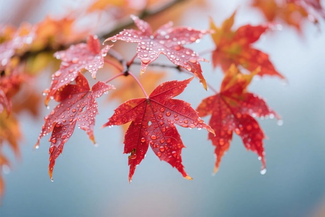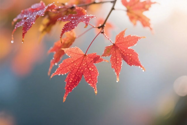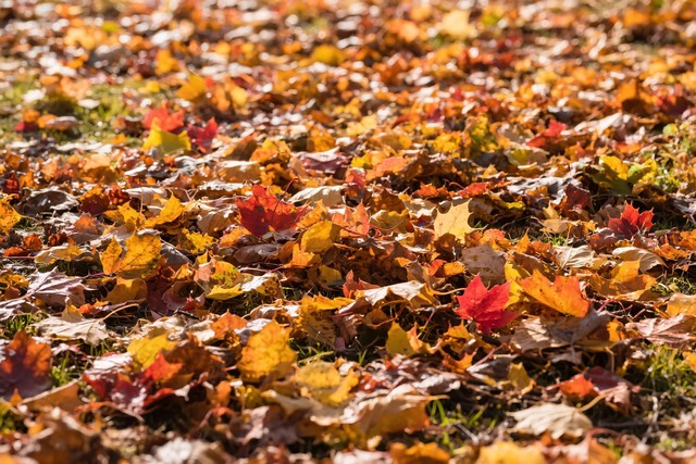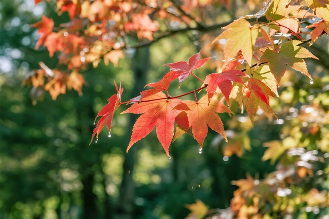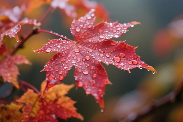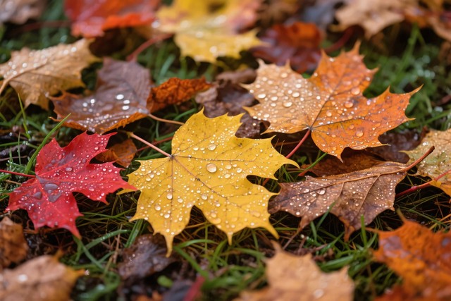 带水珠的多彩秋叶铺于草地,水珠,自然