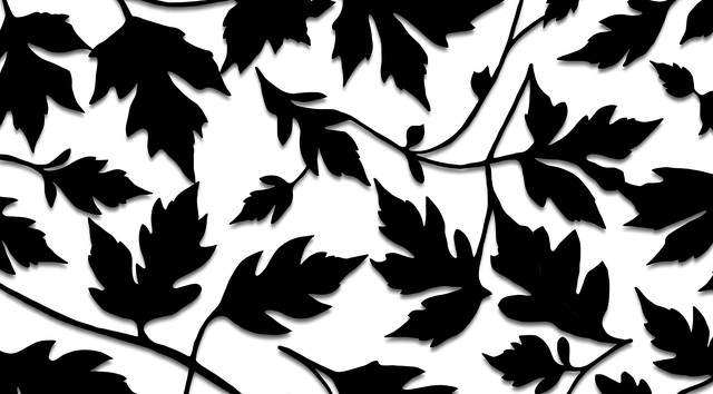 黑色叶子与白色背景相映,构成一幅植物剪影的简约图案,自然元素的黑白花纹点缀其间。