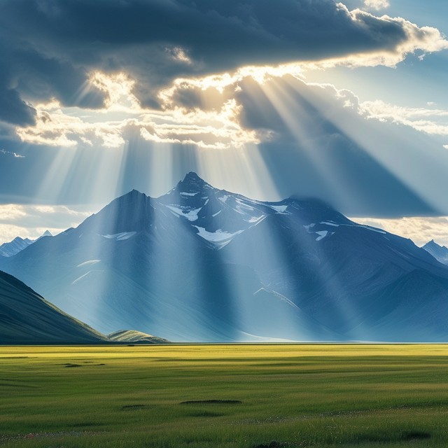 壮丽的高山和广阔的草原,阳光透过云层洒下,展现出宁静自然的美丽景观。
