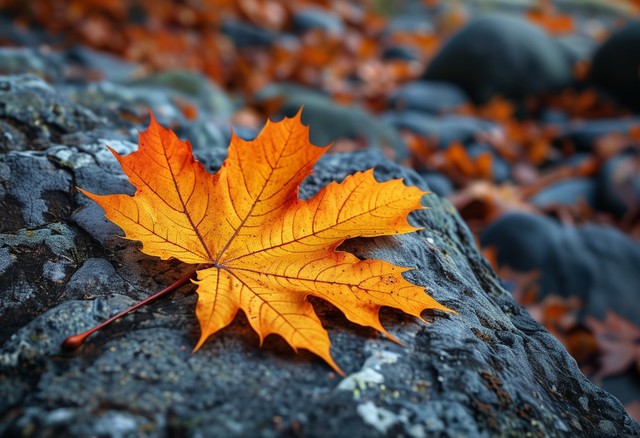 秋天的枫叶静静地躺在岩石上,展现出自然的美丽。