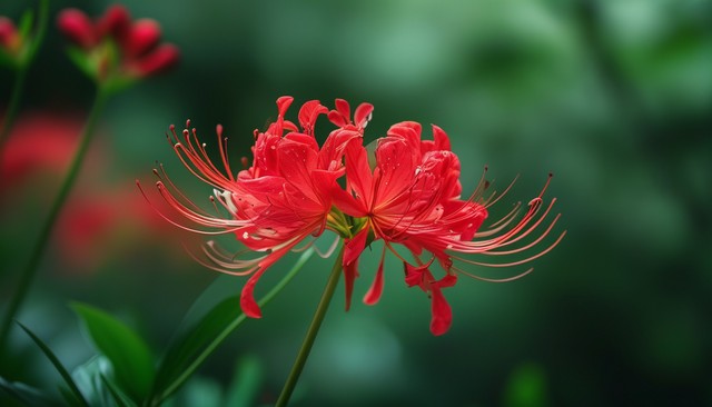 精致的红花在大自然中绽放。自然绿色环境中精致花朵上充满活力的红色花瓣。