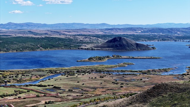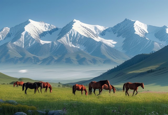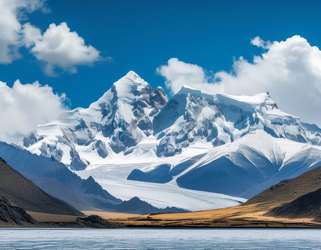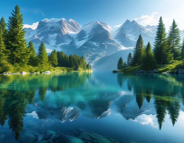 清澈碧绿的湖水与宏伟的山脉相映成趣,周围环绕着郁郁葱葱的松树,展现出壮丽而宁静的自然风光。