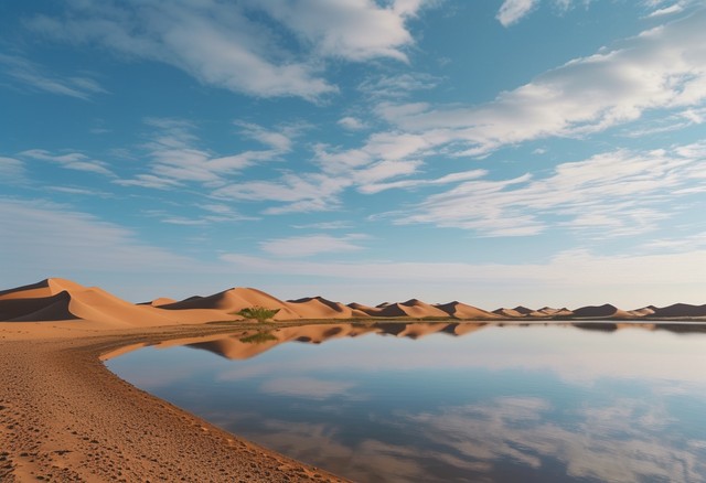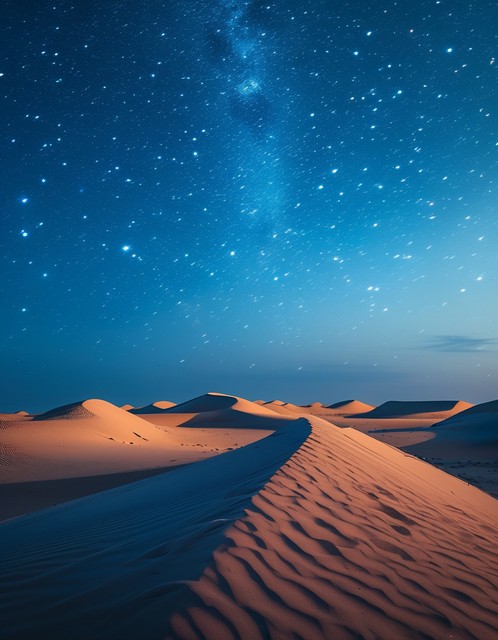 蓝色星空,繁星点点,静谧夜空下的沙漠沙丘自然风光,户外天空夜晚暗色宁静幻想商务大自然背景概念图像