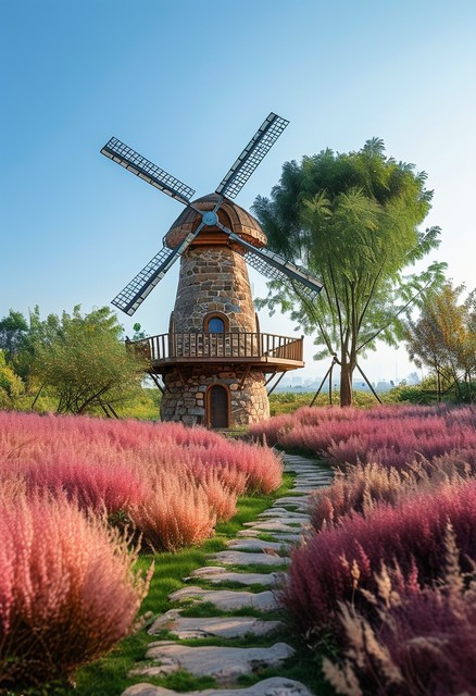 成都我的田园自然王国的大风车,地肤草,大草坪