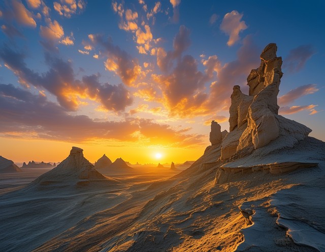 中国新疆乌尔禾风城魔鬼城金色日落光影