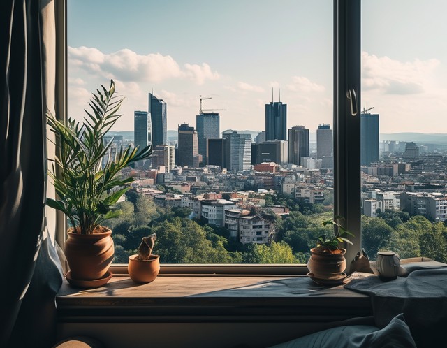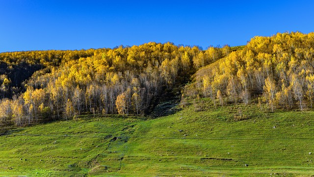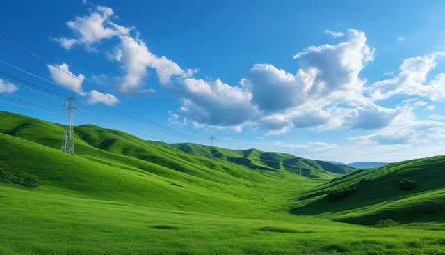 宽广的蓝天与白云,电力线路穿越苍翠的山丘,展现出自然与人造景观的和谐。