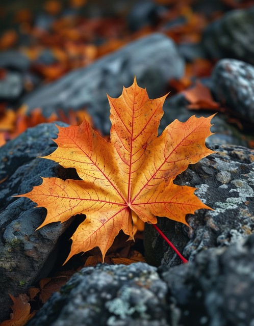 秋天的枫叶静静地躺在岩石上,展现出自然的美丽。