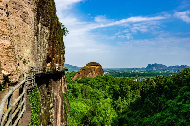 江西,鹰潭,龙虎山,峰林型丹霞山,直立的巨大山体、空中栈道、远处的山峦和小镇