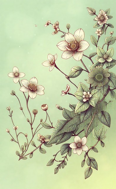 艺术绘画中,抽象植物与线条植物交织出自然元素的美丽画卷。