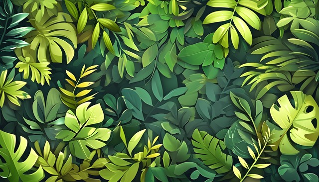 郁郁葱葱的雨林,阳光透过树叶洒下,充满生机。