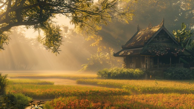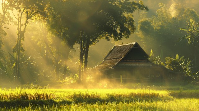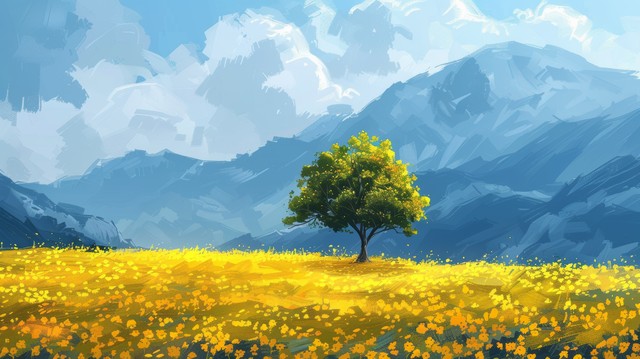 一个宁静的自然场景。中心位置有一棵枝繁叶茂的大树