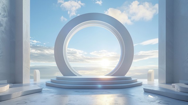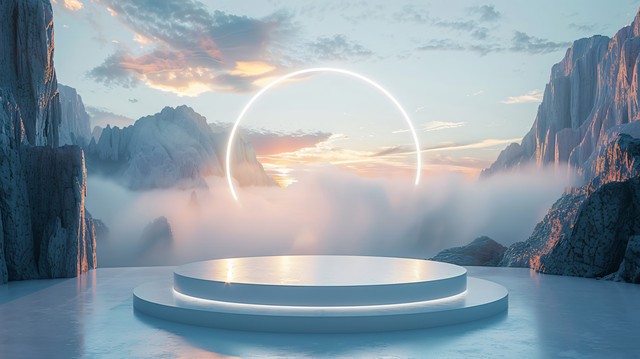 "和谐共融:自然风光前的产品展台,展示与自然和谐共生的现代设计理念"