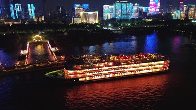 武汉汉口江滩与长江上的知音号游船夜景航拍