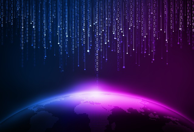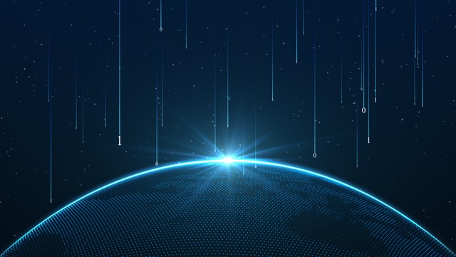 数码地球、点线、01二进制数据组合,寓意全球化、国际化,互联网大数据科技背景。