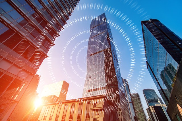 现代商业金融建筑仰视,5G互联网智慧城市高速发展,人工智能大数据概念视图
